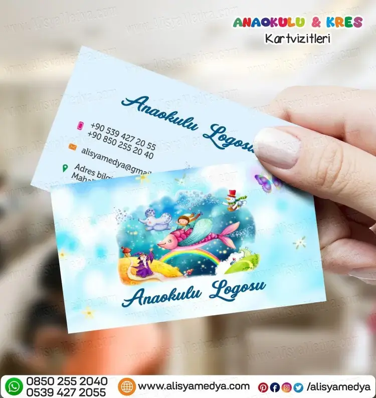Hayal dünyasını geliştiren mavi pastel renklerde hazırlanmış anaokulu, kreş, okul öncesi eğitim kartvizit tasarım örneği Alisya Medya'da! Hızlı Sipariş için İletişime Geçin.