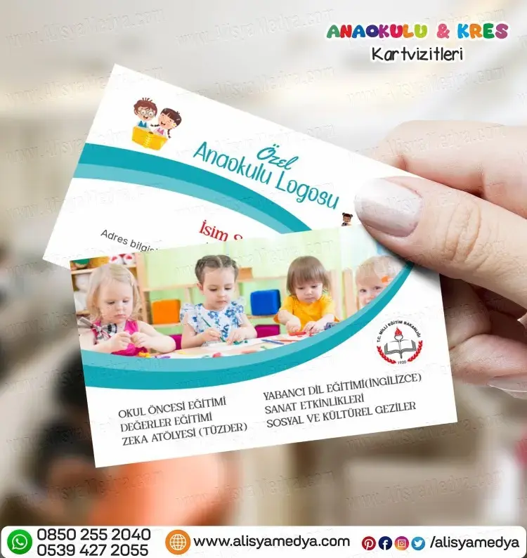 Online tasarım ve Online matbaa hizmetleri sunan Alisya Medya'nın tasarladığı bu okul-eğitim kartvizit, işletmenizin imajını güçlendirecek ve müşterileriniz üzerinde kurumsal ve profesyonel bir ilk izlenim bırakacaktır. Anaokulu, Kreş kartvizit baskı ve tasarım ihtiyaçlarınız için ideal bir seçenek olan bu ürün, aynı zamanda markanızın bilinirliğini artıracak ve akılda kalıcı olmanızı sağlayacaktır.