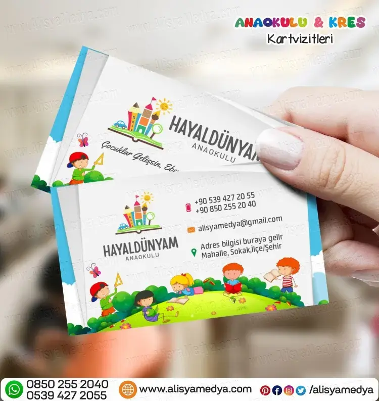 Online tasarım ve Online matbaa hizmetleri sunan Alisya Medya'nın tasarladığı bu okul-eğitim kartvizit, işletmenizin imajını güçlendirecek ve müşterileriniz üzerinde kurumsal ve profesyonel bir ilk izlenim bırakacaktır. Anaokulu, Kreş kartvizit baskı ve tasarım ihtiyaçlarınız için ideal bir seçenek olan bu ürün, aynı zamanda markanızın bilinirliğini artıracak ve akılda kalıcı olmanızı sağlayacaktır.