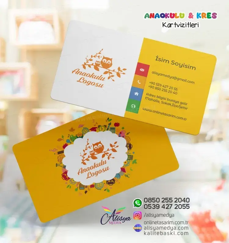 Online tasarım ve Online matbaa hizmetleri sunan Alisya Medya'nın tasarladığı bu okul-eğitim kartvizit, işletmenizin imajını güçlendirecek ve müşterileriniz üzerinde kurumsal ve profesyonel bir ilk izlenim bırakacaktır. Anaokulu, Kreş kartvizit baskı ve tasarım ihtiyaçlarınız için ideal bir seçenek olan bu ürün, aynı zamanda markanızın bilinirliğini artıracak ve akılda kalıcı olmanızı sağlayacaktır.