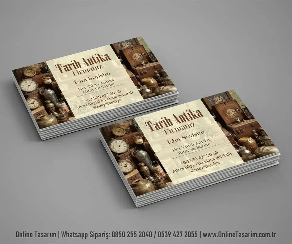 Online Tasarım olarak, antika satıcıları, koleksiyoncular, vintage ürün dükkanları, sahaflar, bitpazarı esnafı ve nostaljik eşya ticaretiyle uğraşan tüm işletmeler için özel olarak hazırlanmış antikacı kartvizit tasarımı ve baskı hizmeti sunuyoruz. Geçmişin izlerini taşıyan bu kartvizitlerle müşterilerinizde güven, estetik ve kalite algısı oluşturun.