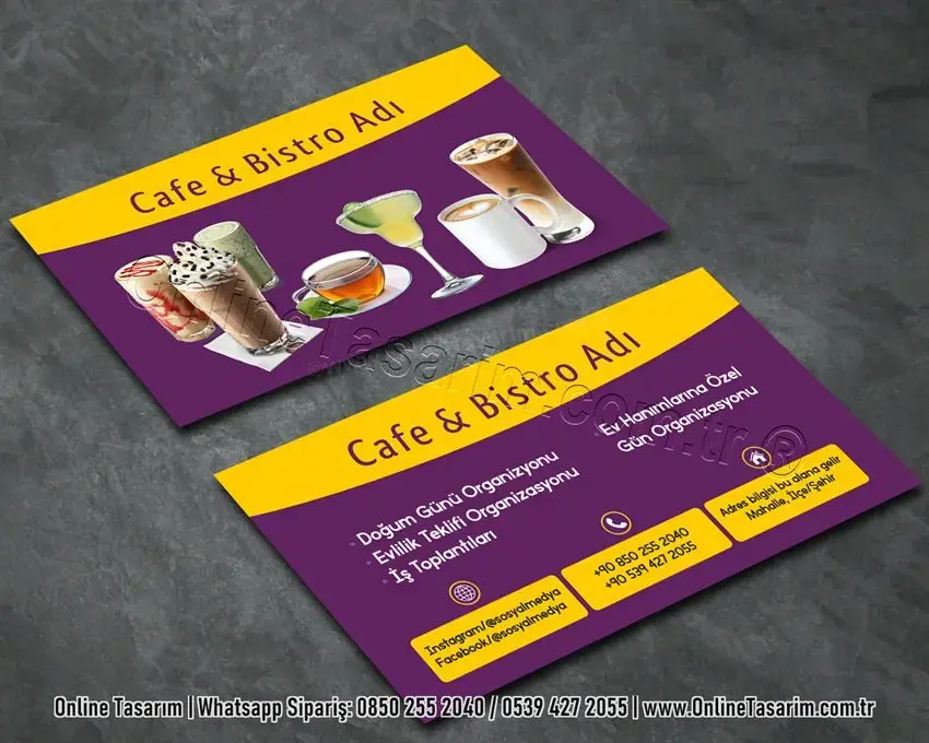 Online Tasarım olarak, kahve dükkanları, kafeler, bistro ve pastaneler gibi yiyecek-içecek sektöründe hizmet veren tüm işletmeler için özel olarak hazırlanmış cafe kartvizit tasarımı ve baskı hizmeti sunuyoruz. Hem sıcak hem de profesyonel bir izlenim bırakan tasarımlarımızla, markanızı etkileyici bir şekilde yansıtabilirsiniz.