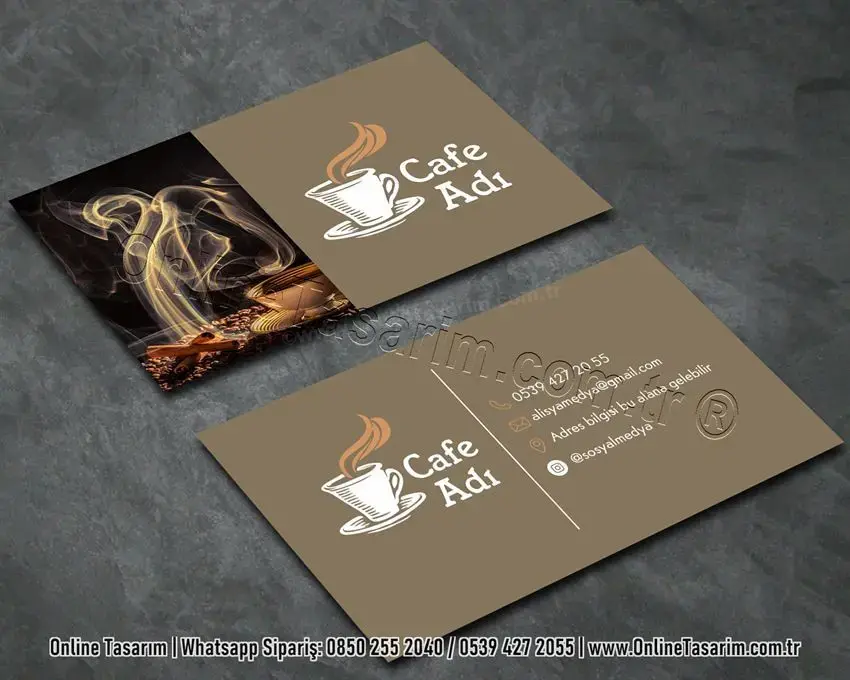 Online Tasarım olarak, kahve dükkanları, kafeler, bistro ve pastaneler gibi yiyecek-içecek sektöründe hizmet veren tüm işletmeler için özel olarak hazırlanmış cafe kartvizit tasarımı ve baskı hizmeti sunuyoruz. Hem sıcak hem de profesyonel bir izlenim bırakan tasarımlarımızla, markanızı etkileyici bir şekilde yansıtabilirsiniz.