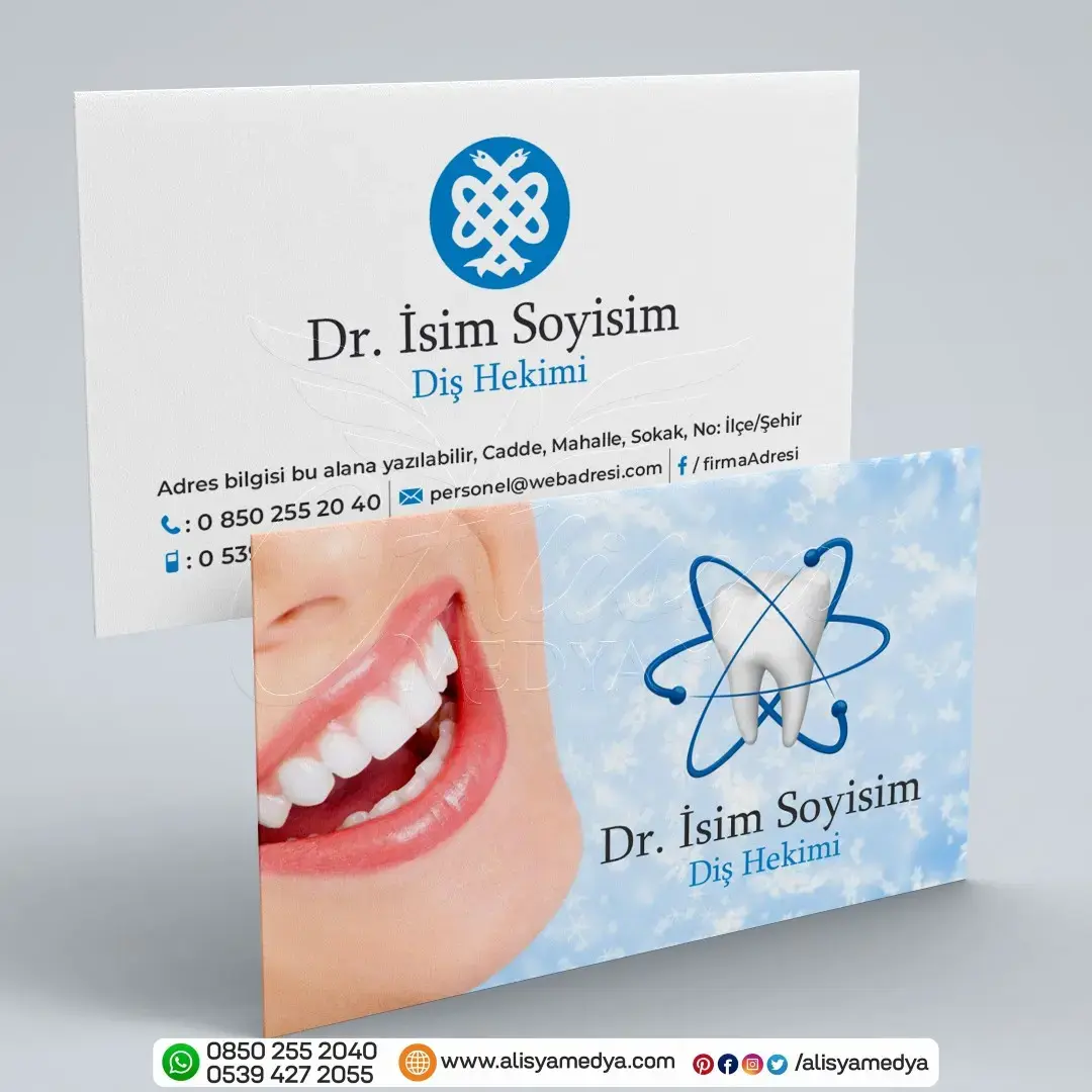 Online tasarım ve Online matbaa hizmetleri sunan Alisya Medya'nın tasarladığı bu diş doktoru sağlık-tıp kartvizit, mesleğinizin imajını güçlendirecek ve müşterileriniz üzerinde güvenilir, profesyonel bir ilk izlenim bırakacaktır. Diş Doktoru kartvizit baskı ve tasarım ihtiyaçlarınız için ideal bir seçenek olan bu ürün, aynı zamanda markanızın bilinirliğini artıracak ve akılda kalıcı olmanızı sağlayacaktır.