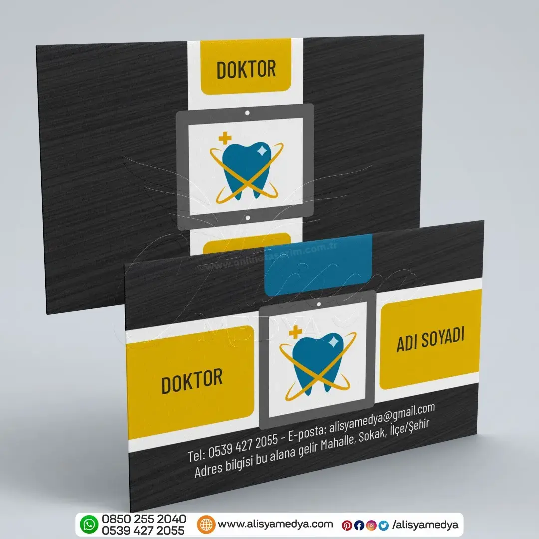 Online tasarım ve Online matbaa hizmetleri sunan Alisya Medya'nın tasarladığı bu diş doktoru sağlık-tıp kartvizit, mesleğinizin imajını güçlendirecek ve müşterileriniz üzerinde güvenilir, profesyonel bir ilk izlenim bırakacaktır. Diş Doktoru kartvizit baskı ve tasarım ihtiyaçlarınız için ideal bir seçenek olan bu ürün, aynı zamanda markanızın bilinirliğini artıracak ve akılda kalıcı olmanızı sağlayacaktır.