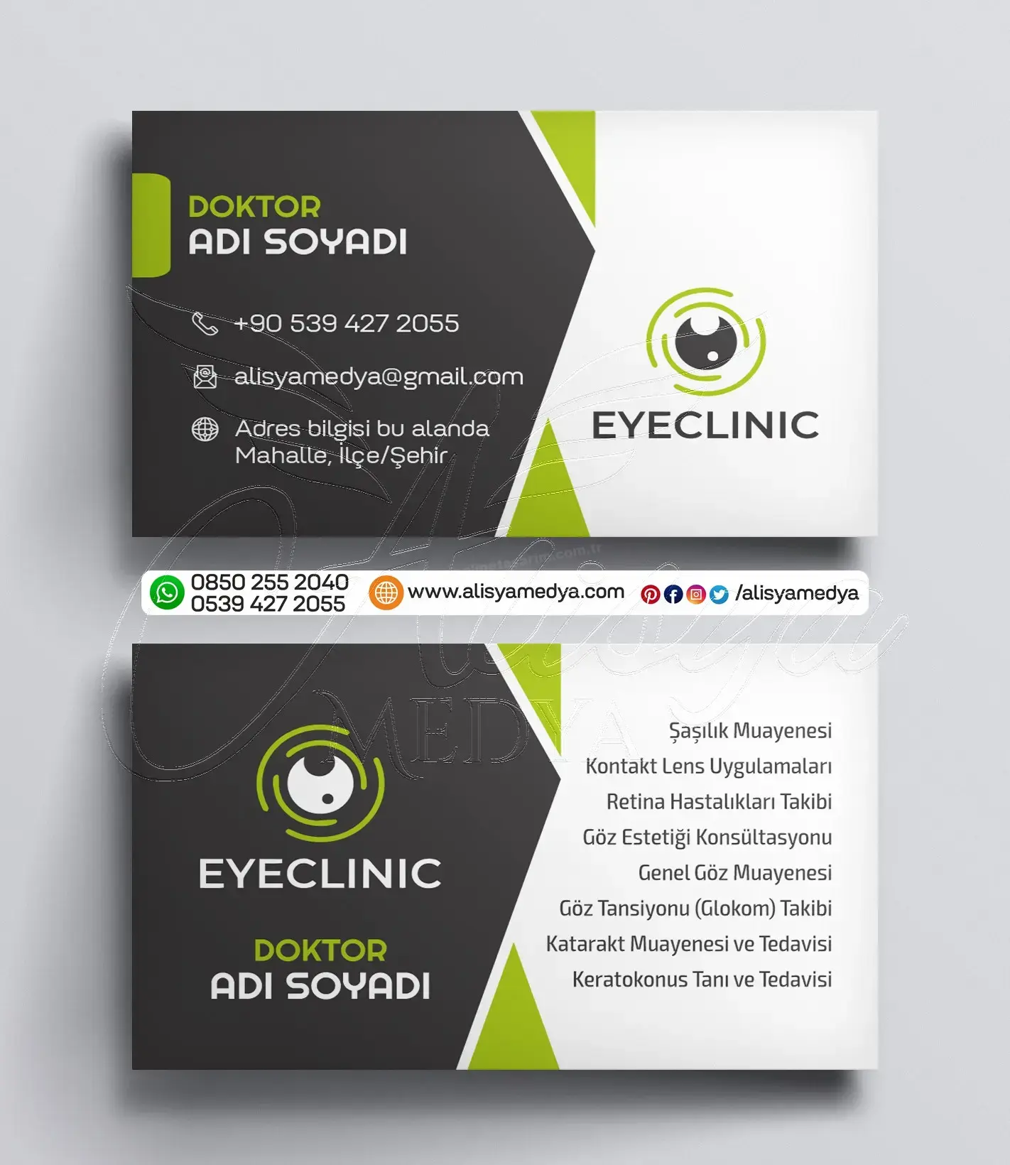 Online tasarım ve Online matbaa hizmetleri sunan Alisya Medya'nın tasarladığı bu göz doktoru sağlık-tıp kartvizit, mesleğinizin imajını güçlendirecek ve müşterileriniz üzerinde güvenilir, profesyonel bir ilk izlenim bırakacaktır. Göz Doktoru kartvizit baskı ve tasarım ihtiyaçlarınız için ideal bir seçenek olan bu ürün, aynı zamanda markanızın bilinirliğini artıracak ve akılda kalıcı olmanızı sağlayacaktır.