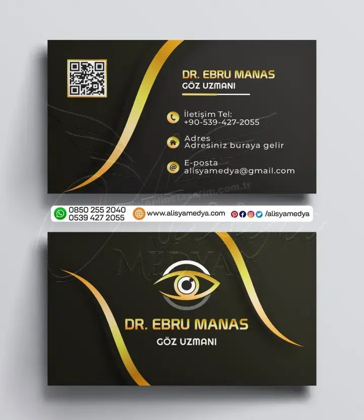 Altın Renk Dalgalı Siyah Arkaplanlı QR Kodlu Kartvizit Baskı Örneği - Göz Doktoru Kartvizit Tasarımı Alisya Medya'da! Hızlı Sipariş için İletişime Geçin.