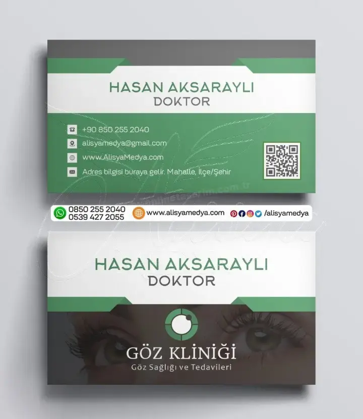 Online tasarım ve Online matbaa hizmetleri sunan Alisya Medya'nın tasarladığı bu göz doktoru sağlık-tıp kartvizit, mesleğinizin imajını güçlendirecek ve müşterileriniz üzerinde güvenilir, profesyonel bir ilk izlenim bırakacaktır. Göz Doktoru kartvizit baskı ve tasarım ihtiyaçlarınız için ideal bir seçenek olan bu ürün, aynı zamanda markanızın bilinirliğini artıracak ve akılda kalıcı olmanızı sağlayacaktır.