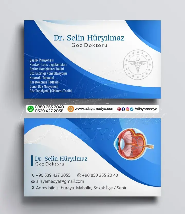 Online tasarım ve Online matbaa hizmetleri sunan Alisya Medya'nın tasarladığı bu göz doktoru sağlık-tıp kartvizit, mesleğinizin imajını güçlendirecek ve müşterileriniz üzerinde güvenilir, profesyonel bir ilk izlenim bırakacaktır. Göz Doktoru kartvizit baskı ve tasarım ihtiyaçlarınız için ideal bir seçenek olan bu ürün, aynı zamanda markanızın bilinirliğini artıracak ve akılda kalıcı olmanızı sağlayacaktır.