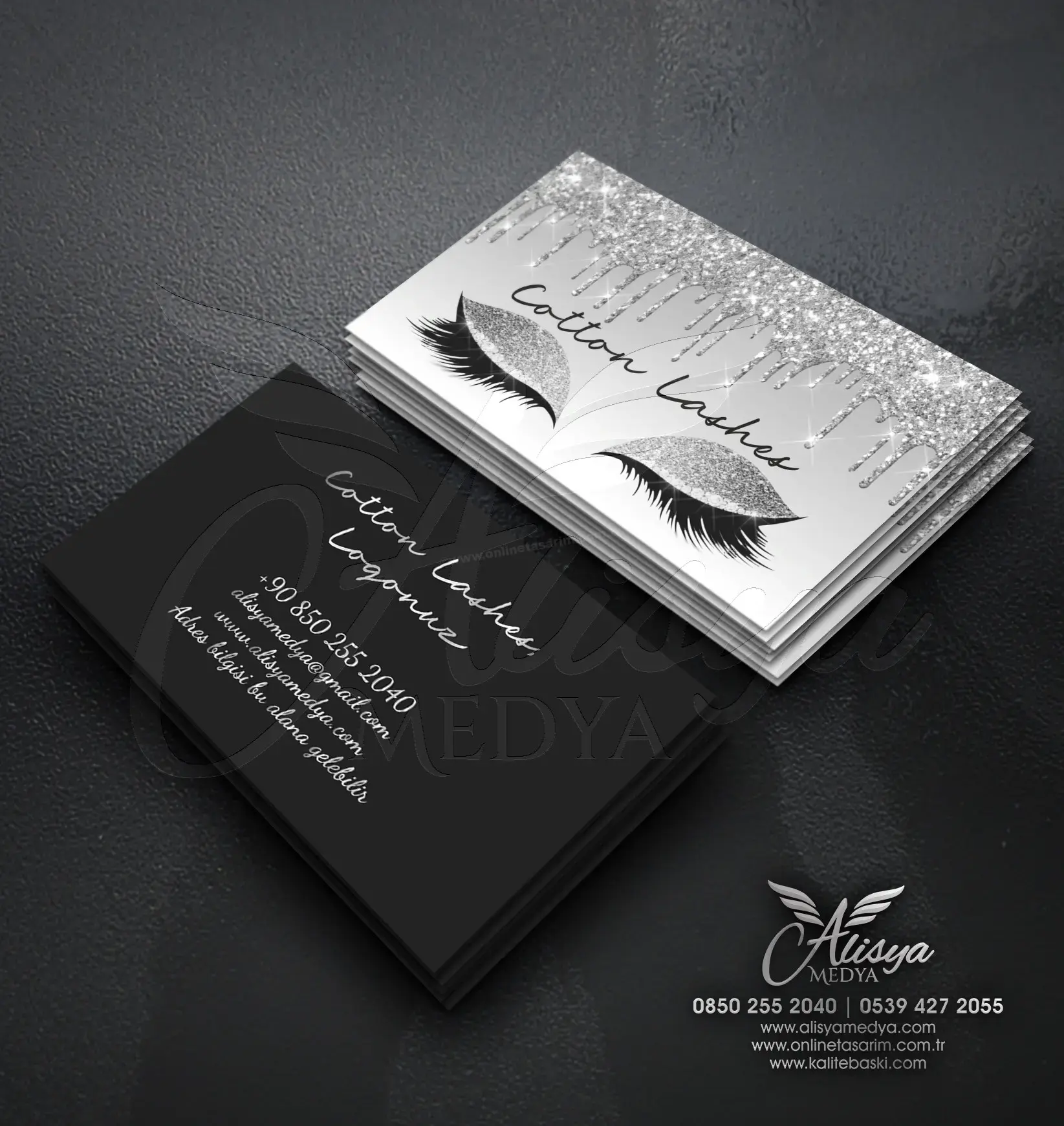 Güzellik, Estetik, Makyaj, Bakım, Güzellik Merkezi, Güzellik Salonları için Kartvizit Baskı Örneği. Siyah ve Silver (Gümüş Renk) Metalik Renklerde Glitter Simli Kirpik Far Logolu, Lüks Güzellik, Spa Kartvizit Tasarımı.