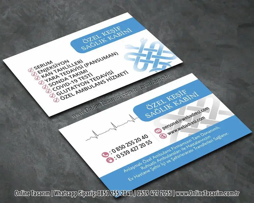 Online Tasarım olarak, hemşireler, evde sağlık hizmeti sunan uzmanlar, sağlık kabini işletenler ve tüm sağlık profesyonelleri için özel olarak hazırlanmış sağlık kartvizit baskı hizmeti sunuyoruz. Mesleki kimliğinizi en iyi şekilde yansıtan kartvizit tasarımlarını kolayca oluşturabilir, yüksek kaliteli baskı seçeneklerimizle hızlıca sipariş verebilirsiniz.